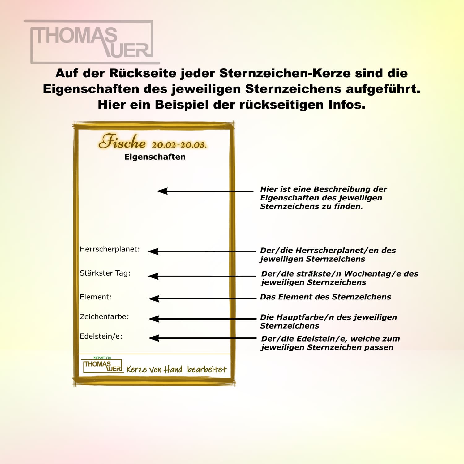 Auf der Rückseite der Kerze ist eine Beschreibung zum entsprechenden Sternzeichen enthalten sowie die Angaben: