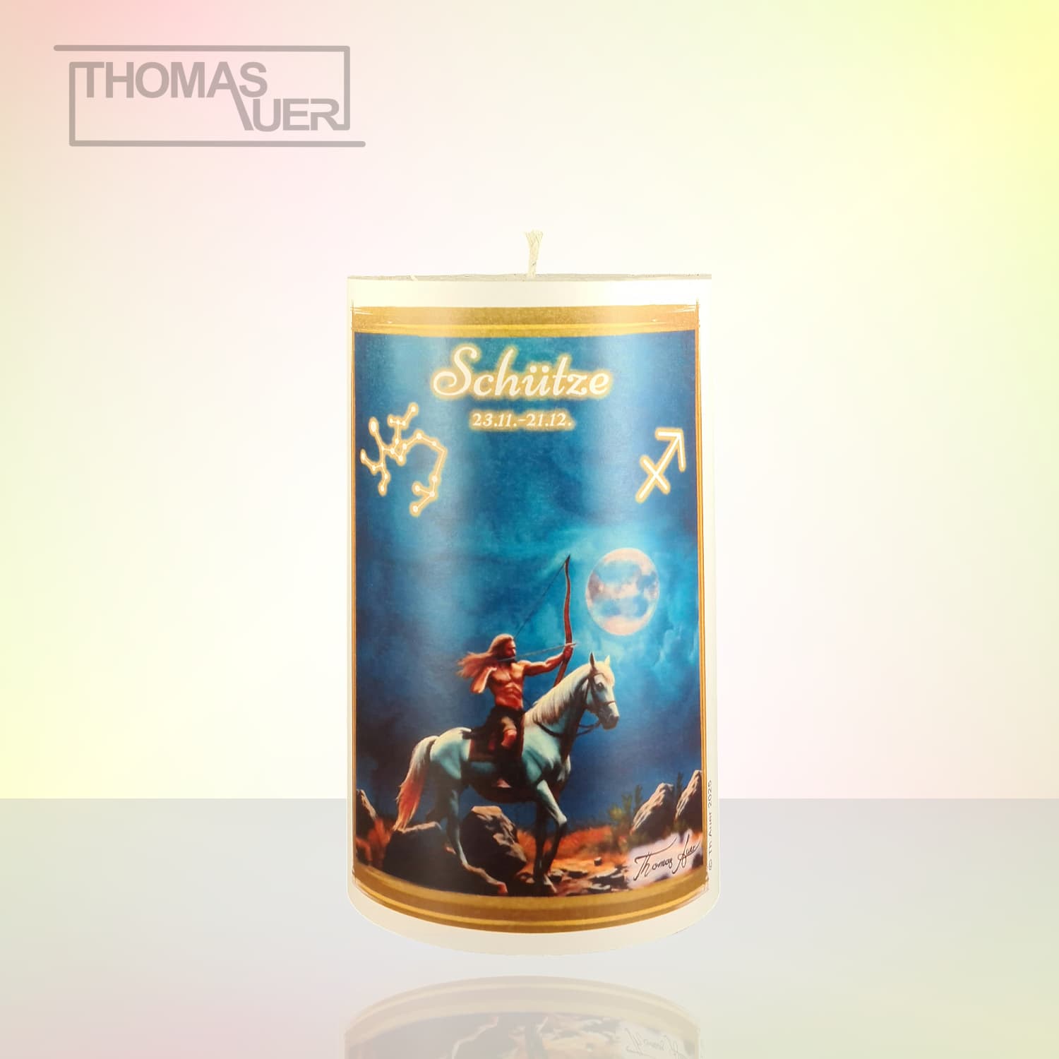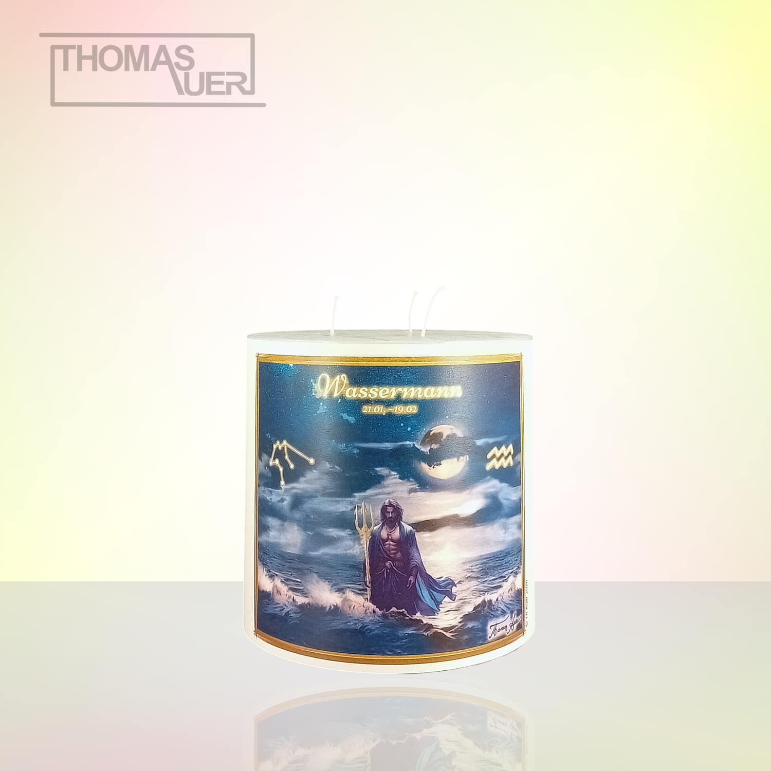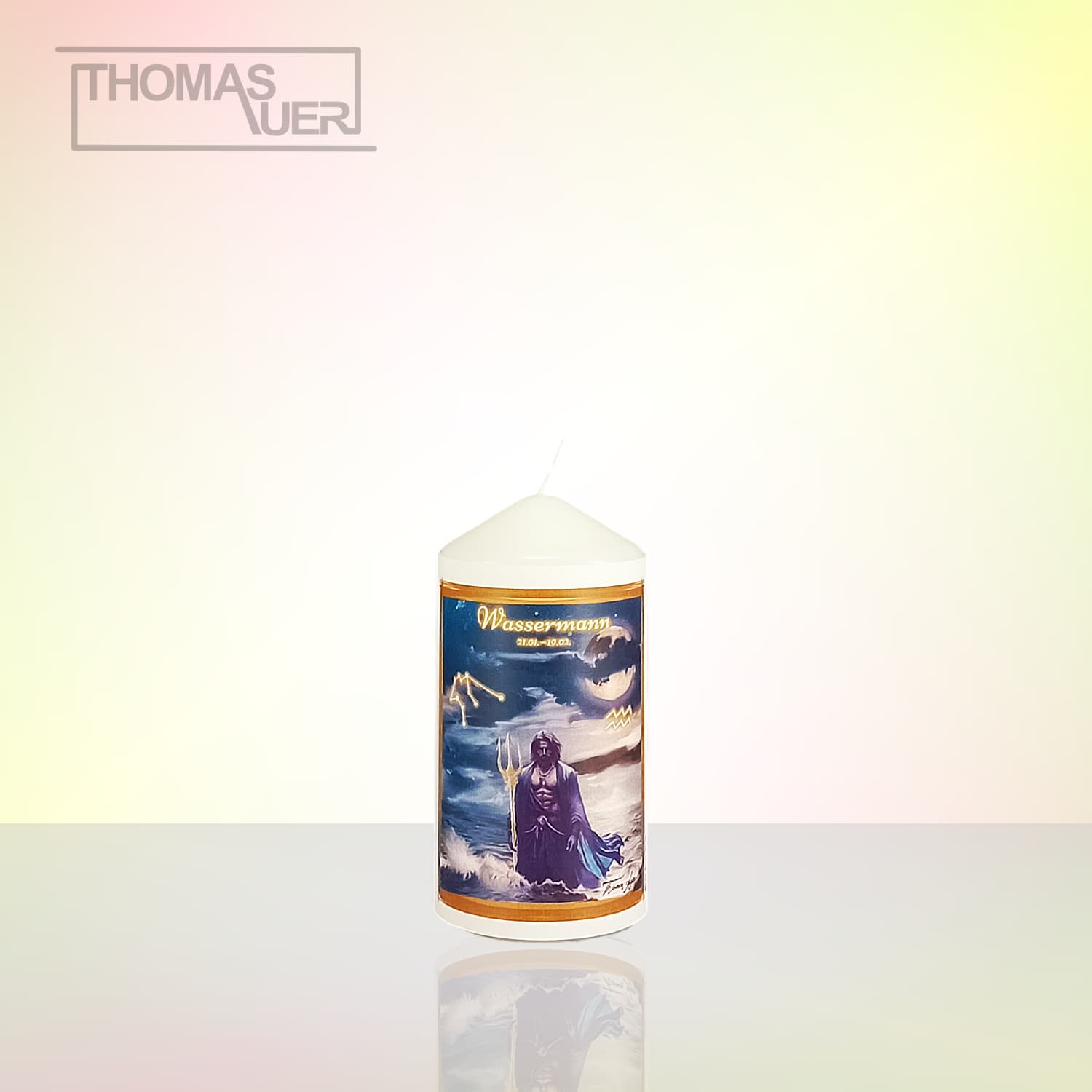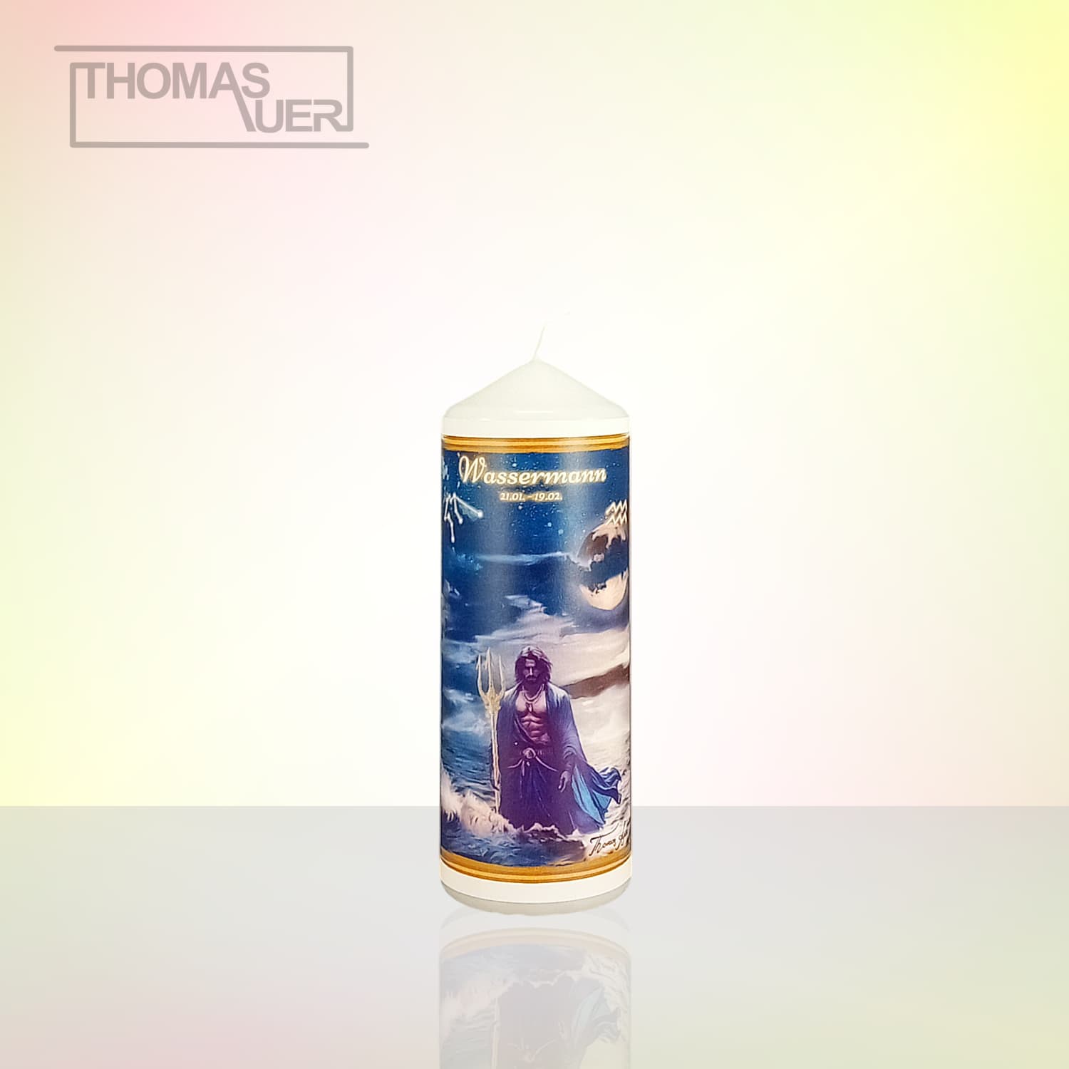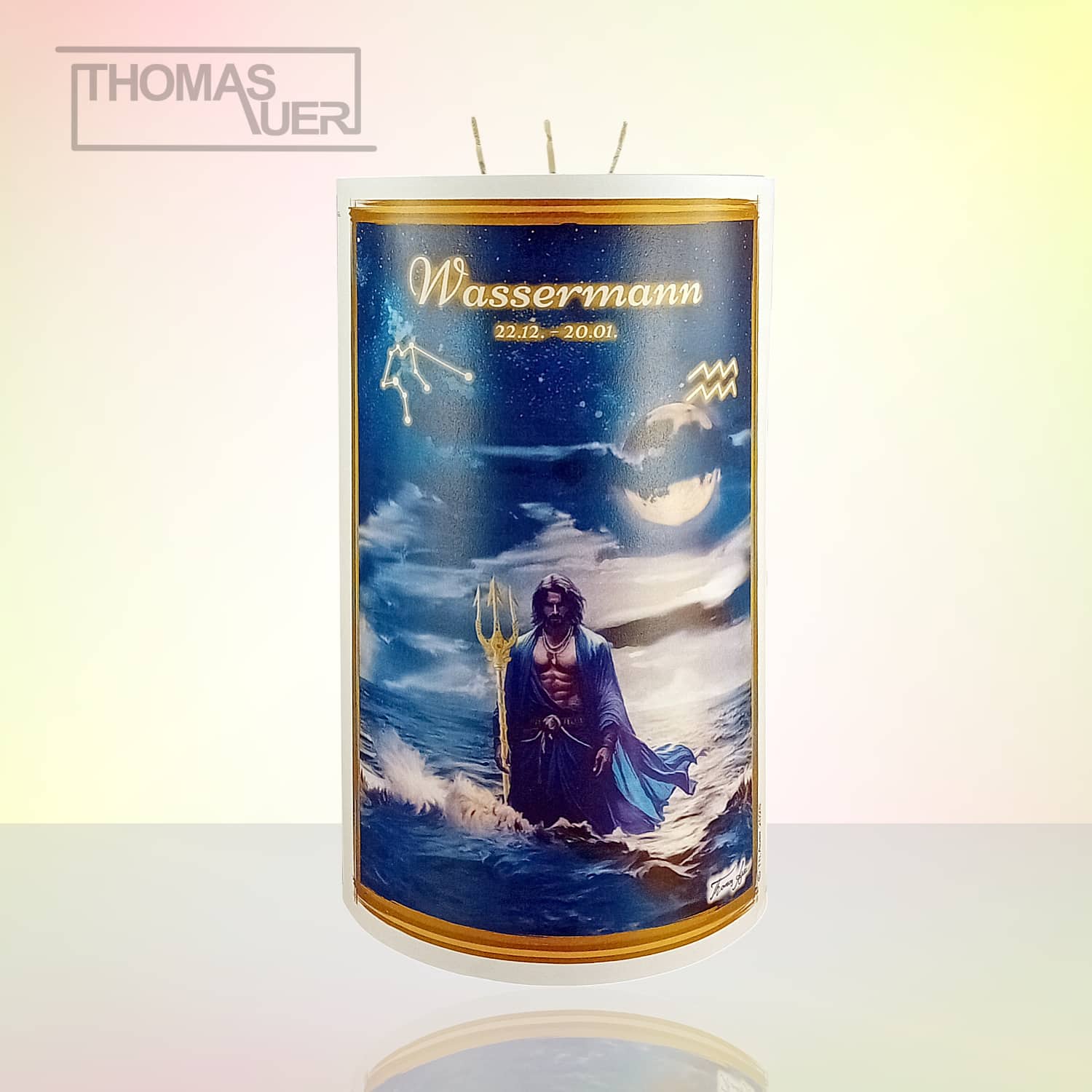 Sternzeichenkerze „Wassermann“. Das Bild ist von Thomas Auer in Ölfarbeneffekt gemalt.